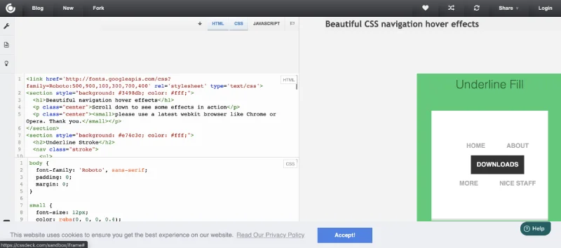 Interestingly, CSS Deck offers the ability to record your process for others to review later on. They call them codecasts; go ahead and watch this one to see how it works. As with the others, you can fork (copy) any public project. However, CSS Deck offers a nice way to embed the code into a website (see below), which can be nice if you have a blog and share what you learn.