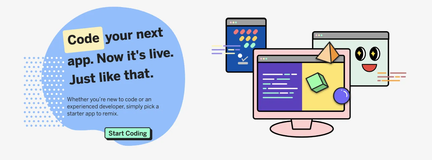 Glitch provides "starter kits," or starting points, for different libraryies such as React, Vue, Angular, Nuxt, Svelte, Ember, and more. They also offer starting projects for creating extensions for platforms such as Slack, Twitch bots, material design, Trello, Spotify, etc.